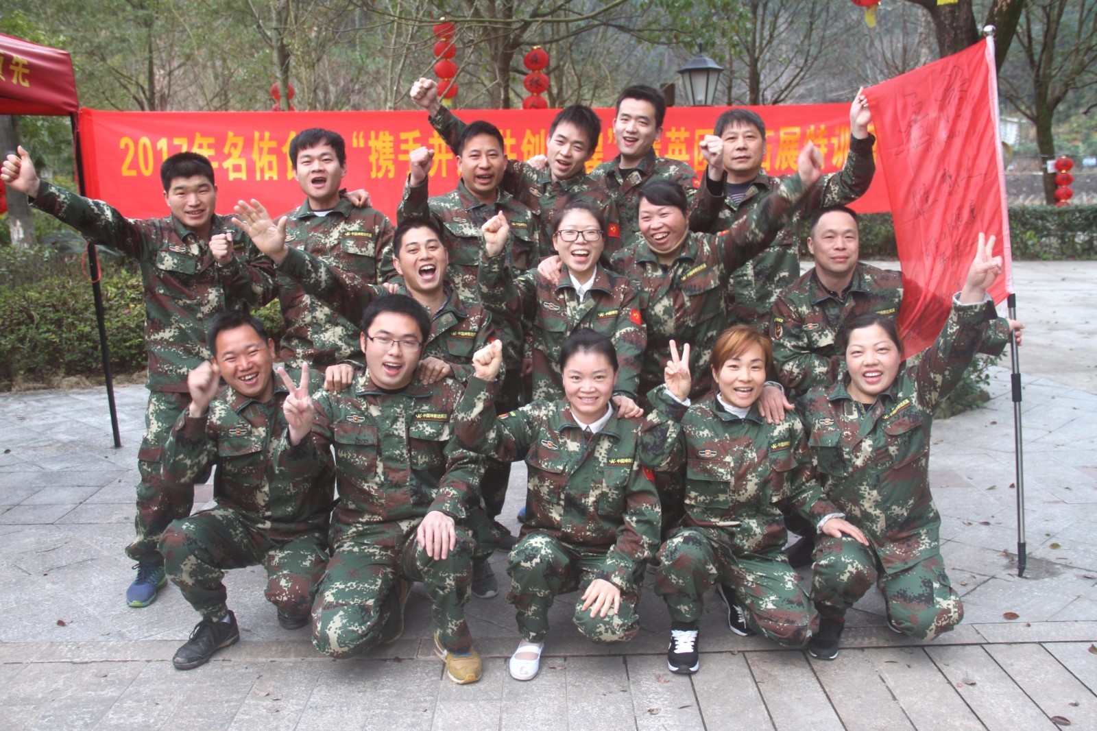 第一天團(tuán)隊(duì)統(tǒng)一著裝迷彩服,進(jìn)行團(tuán)隊(duì)組建并建立統(tǒng)一的團(tuán)隊(duì)目標(biāo)。參加心情撲克牌、高空抓桿、盜夢(mèng)空間、七巧板等項(xiàng)目。
